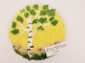 En la ensalada terminada con mayonesa, dibuja el tronco y las ramas del futuro abedul, agregue rayas de aceitunas al tronco, forme una corona de verde cebollas o perejil, que también pueden servir como decoración hierba en la base del tronco. Los champiñones servirán como una gran imitación. boletus, acechando en la hierba bajo un amado ruso un arbol