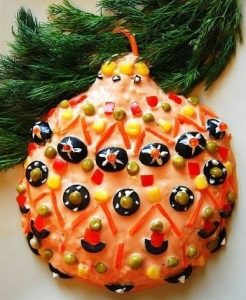 Ensalada en forma de bola de Navidad, la principal cuyos ingredientes son pollo y ciruelas pasas, se está preparando lo suficientemente simple Los productos se presentan en capas y ciruelas pasas le da al plato un sabor especial. El plato resulta muy original ya que al gusto y en forma de servir.