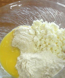 - Tamizar la harina de maíz y trigo en un tazón. Agregue queso feta y mantequilla derretida, levadura en polvo, mezcle todo a mano.