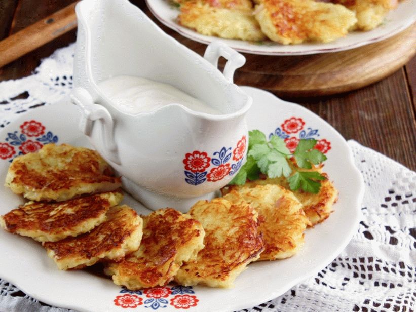 Extienda la mezcla con una cuchara en una sartén caliente con aceite vegetal y freír durante 5-7 minutos cada uno lado.