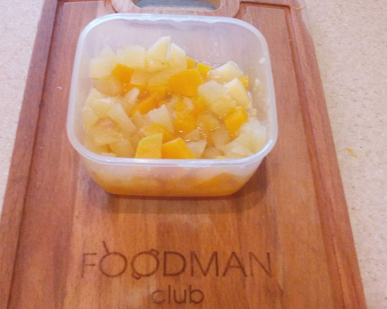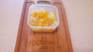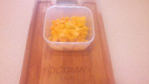 - Cortar un trozo de calabaza, pelar y cortar en trozos pequeños. cuadrados. Poner en un recipiente para microondas.