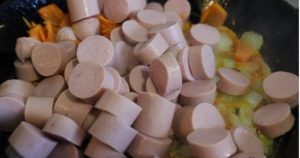 - Durante este tiempo, fríe las zanahorias con cebolla hasta que estén suaves y se duerma. a ellos círculos de salchichas. Freír por 2-3 minutos.